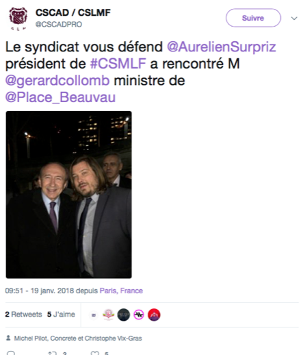 Aussi la photo de Ministre de l’Intérieur avec Aurélien Surpriz (alias Aurélien Dubois) qui s’accompagne du texte : « Le Syndicat vous défend @ Aurelien Surpriz président de La CSMLF (sic) a rencontré M. @gérard collomb ministre de @Place Beauvau » n’est-elle pas, dans le contexte de droit de dérogation accordé à 19 Préfets, de nature à nous rassurer sur la neutralité de M. Collomb.